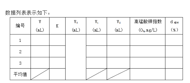 式中,V0—空白實(shí)驗(yàn)中高錳酸鉀溶液消耗量(mL); V2—水樣量(mL);